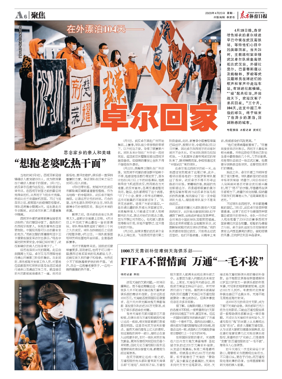 4月18日晚,身穿橙色球衣的卓尔球迷早已守候在武汉高铁站,等待他们心目中的英雄回家。当天21时,主教练何塞率领武汉卓尔队乘坐高铁抵达武汉站,外援拉斐尔、巴普蒂斯唐以及姚翰林、罗毅等武汉籍球员在球迷们的歌声和掌声中走出车站。有球迷拉起横幅,“‘疫’起共担当,并肩战天下,欢迎汉军子弟兵回家。”三个月,104天,这支中超二年级的球队,终于结束了在异乡的漂泊,回到熟悉的城市。