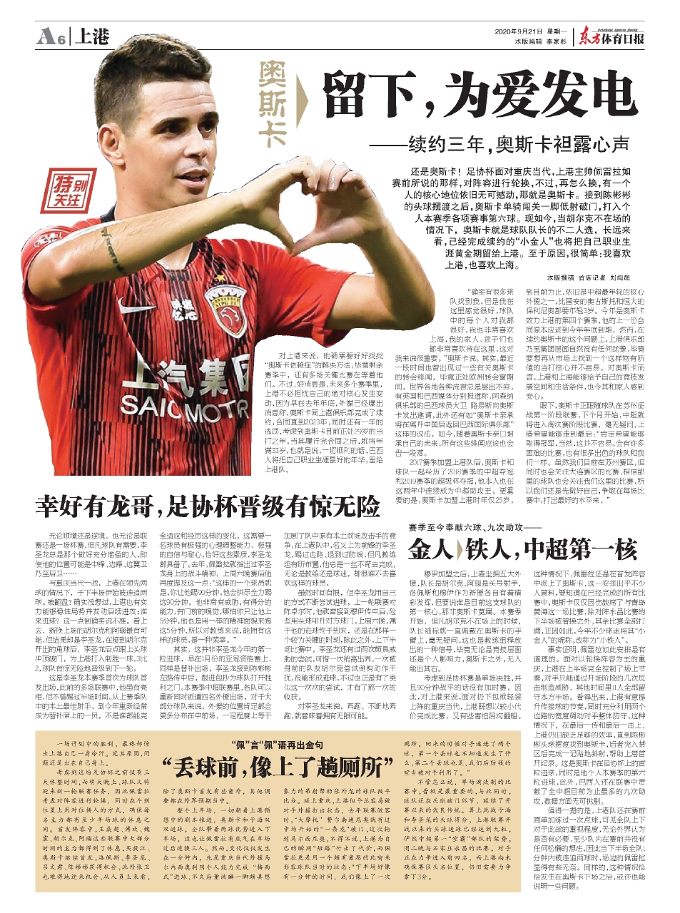 还是奥斯卡!足协杯面对重庆当代,上港主帅佩雷拉如赛前所说的那样,对阵容进行轮换,不过,再怎么换,有一个人的核心地位依旧无可撼动,那就是奥斯卡。接到陈彬彬的头球摆渡之后,奥斯卡单骑闯关一脚低射破门,打入个人本赛季各项赛事第六球。现如今,当胡尔克不在场的情况下,奥斯卡就是球队队长的不二人选,长远来看,已经完成续约的“小金人”也将把自己职业生涯黄金期留给上港。至于原因,很简单:我喜欢上港,也喜欢上海。