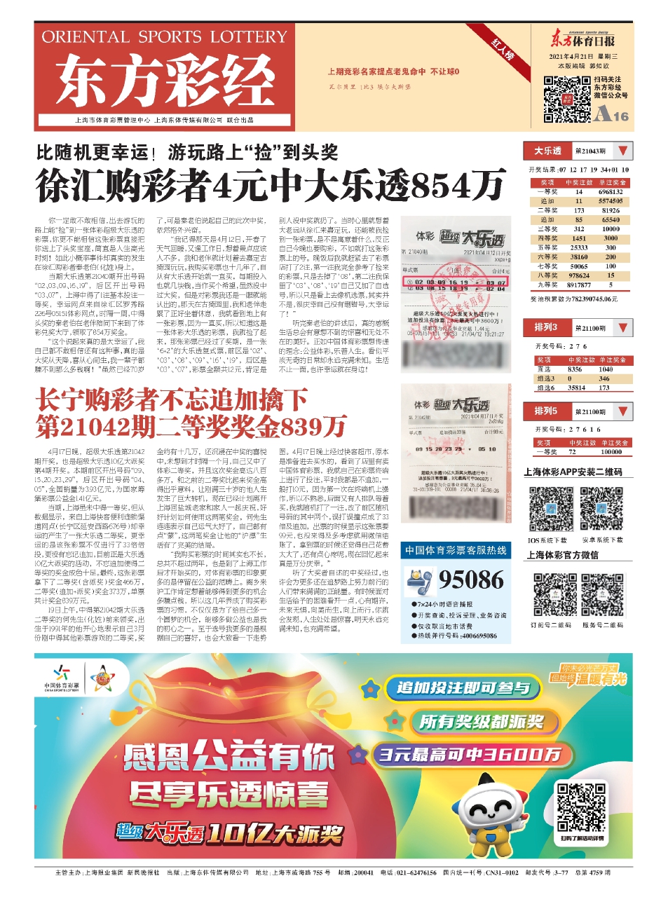 “我记得那天是4月12日,开春了天气回暖,又逢工作日,想着景点应该人不多,我和老伴就计划着去嘉定古猗园玩玩。我购买彩票也十几年了,自从有大乐透开始就一直买,每期投入也就几块钱,当作买个希望,虽然没中过大奖,但是对彩票我还是一眼就能认出的。那天在古猗园里,我和老伴走累了正好坐着休息,我就看到地上有一张彩票,因为一直买,所以知道这是一张体彩大乐透的彩票,我就捡了起来,那张彩票已经过了奖期,是一张‘6+2’的大乐透复式票,前区是‘02’、‘03’、‘08’、‘09’、‘16’、‘19’,后区是‘03’、‘07’,彩票金额共12元,肯定是别人没中奖就扔了。当时心里就想着大老远从徐汇来嘉定玩,还能被我捡到一张彩票,是不是寓意着什么,反正自己今晚也要购彩,不如就打这张彩票上的号。晚饭后我就赶紧去了彩票店打了2注,第一注我完全参考了捡来的彩票,只是去掉了‘08’,第二注我保留了‘03’、‘08’、‘19’自己又加了自选号,所以只是看上去像机选票,其实并不是,很庆幸自己没有删错号,太幸运了!”