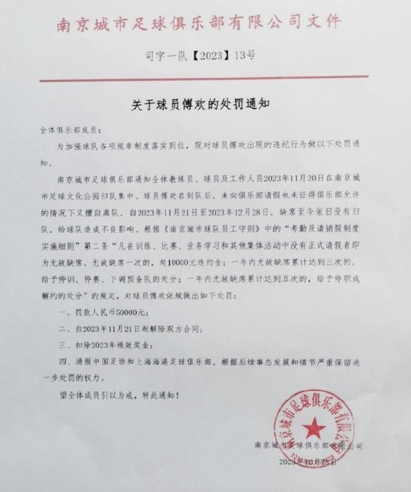 2023年最后一天,源自中甲南京城市足球俱乐部内部的一则处罚通知被公布于网上,内容是对于球员傅欢的处罚:由于在11月20日到队后,未向俱乐部请假也未征得允许的情况下擅自离队,且自2023年11月21日至2023年12月28日缺席至今依旧没有归队,给球队造成不良影响。因此,根据相关员工守则,给予傅欢包括罚款、解除合同、扣除绩效奖金等多项处罚。