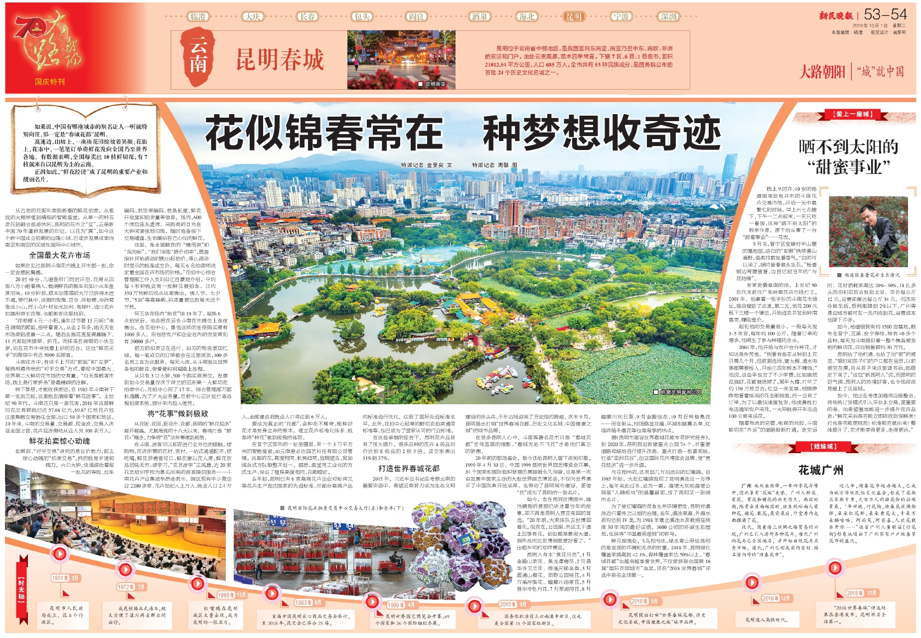从古老的花街叫卖到新潮的鲜花拍卖,从粗放的大棚种植到精细的智能温室,从单一的种花卖花到融合旅游休闲,昆明的花市之“变”,正是新中国70年蓬勃发展的印证。以花为“媒”,如今这个新中国成立初期的边陲小城,已逐步发展成面向南亚东南亚的区域性国际中心城市。