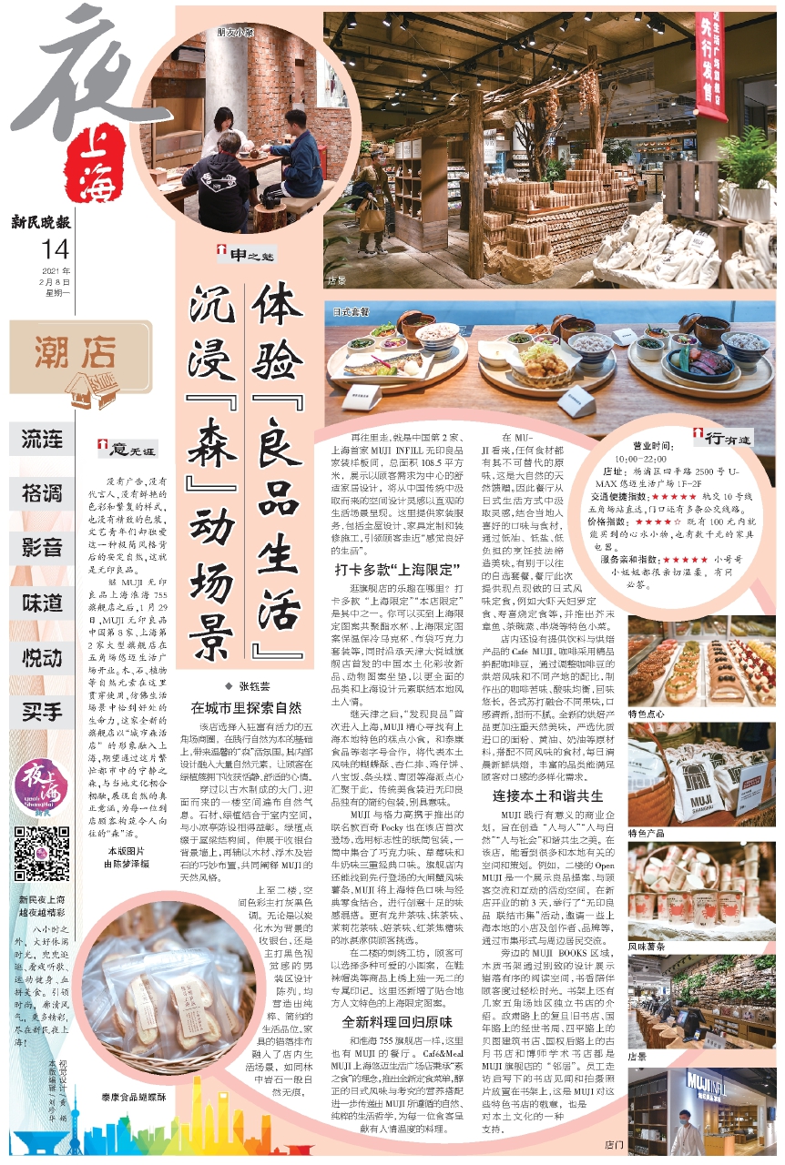 继MUJI无印良品上海淮海755旗舰店之后,1月29日,MUJI无印良品中国第8家、上海第2家大型旗舰店在五角场悠迈生活广场开业。木、石、植物等自然元素在这里贯穿使用,仿佛生活场景中恰到好处的生命力,这家全新的旗舰店以“城市森活店”的形象融入上海,期望通过这片繁忙都市中的宁静之森,与当地文化相合相融,展现自然的真正意涵,为每一位到店顾客构筑令人向往的“森”活。