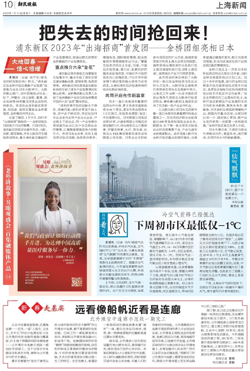 记者了解到,1月9日,2023年“出海招商”首发团——金桥团组赴日招商之行拉开帷幕。5天时间内,浦东新区团组足迹遍布东京、大阪、京都、福冈等地,并在大阪召开专题投资说明会,推介浦东新区最新的产业发展情况、制造业相关政策和金桥最新的产业发展规划。