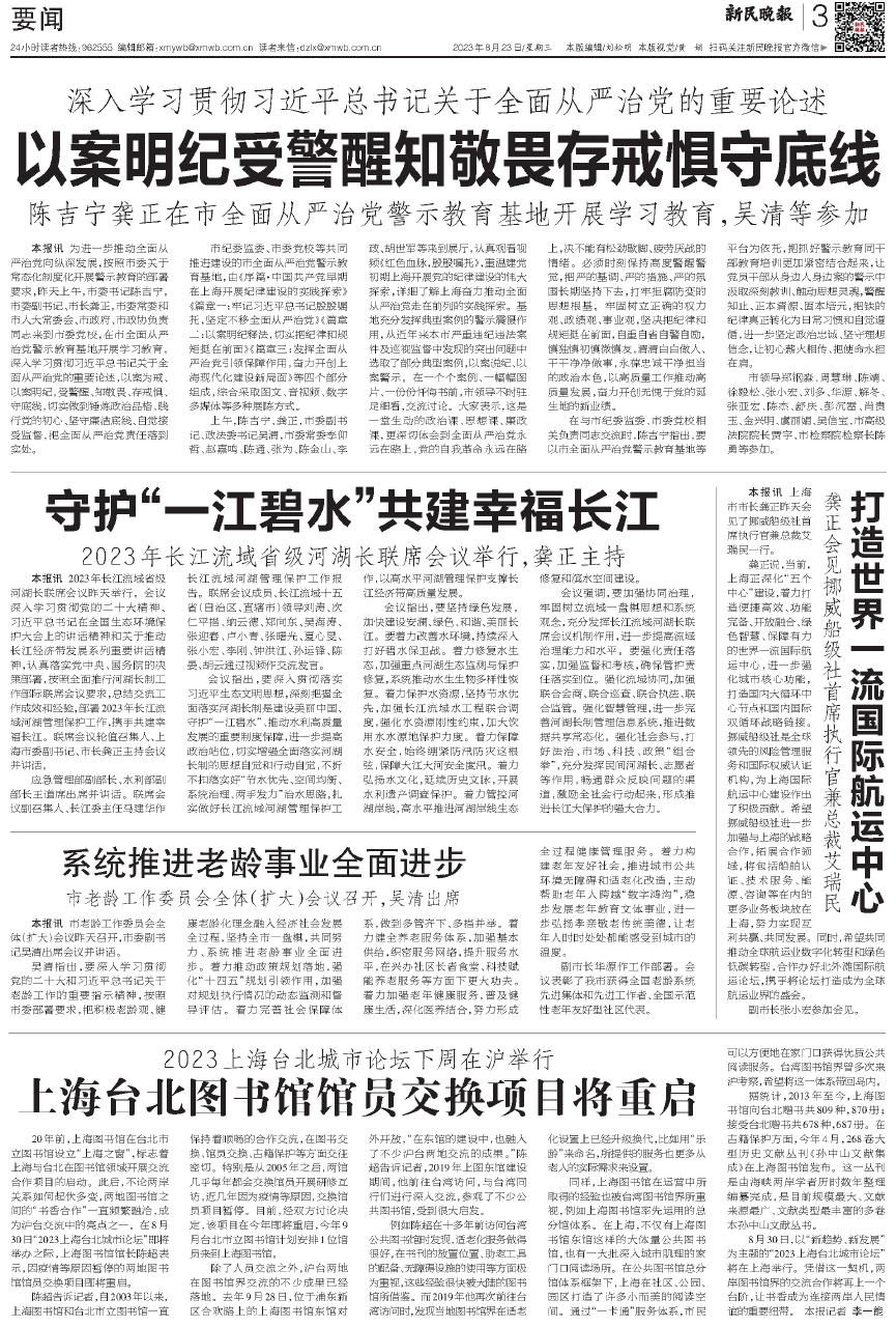 上午,陈吉宁、龚正,市委副书记、政法委书记吴清,市委常委李仰哲、赵嘉鸣、陈通、张为、陈金山、李政、胡世军等来到展厅,认真观看视频《红色血脉,殷殷嘱托》,重温建党初期上海开展党的纪律建设的伟大探索,详细了解上海奋力推动全面从严治党走在前列的实践探索。基地充分发挥典型案例的警示震慑作用,从近年来本市严重违纪违法案件及巡视监督中发现的突出问题中选取了部分典型案例,以案说纪、以案警示。在一个个案例、一幅幅图片、一份份忏悔书前,市领导不时驻足细看,交流讨论。大家表示,这是一堂生动的政治课、思想课、廉政课,更深切体会到全面从严治党永远在路上,党的自我革命永远在路上,决不能有松劲歇脚、疲劳厌战的情绪。必须时刻保持高度警醒警觉,把严的基调、严的措施、严的氛围长期坚持下去,打牢拒腐防变的思想根基。牢固树立正确的权力观、政绩观、事业观,坚决把纪律和规矩挺在前面,自重自省自警自励,慎独慎初慎微慎友,清清白白做人、干干净净做事,永葆忠诚干净担当的政治本色,以高质量工作推动高质量发展,奋力开创无愧于党的诞生地的新业绩。