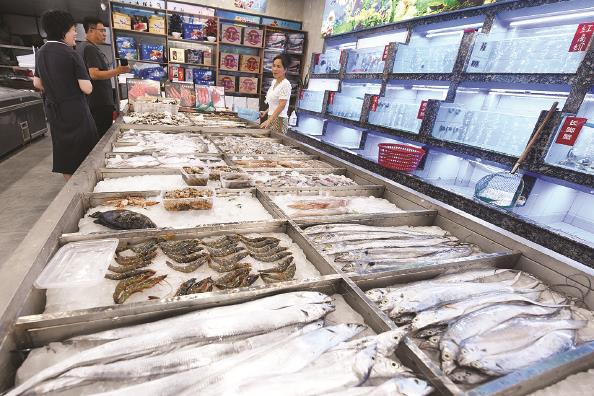 作为上海唯一的国家一级渔港,横沙国际渔港每天有大量的进口、本地海鲜从这里进入本市各地商超市场。在一家水产零售店,记者看到店主正忙着打包梭子蟹和带鱼。