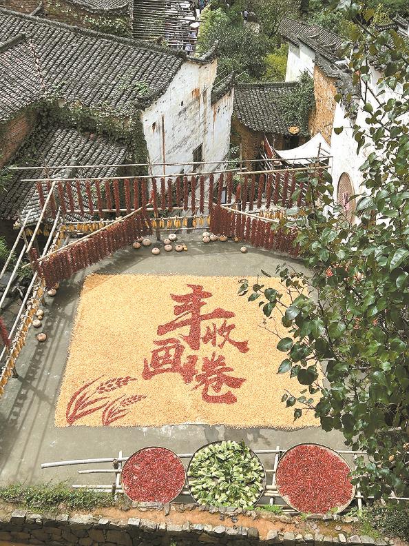 红的辣椒,黄的玉米,白的芸豆,摆满圆圆的竹匾,躺在伸出房屋的晒杆上,恣意享受阳光。衬着徽派建筑的灰瓦白墙,坐落在山崖上的村庄顿时绚烂起来。