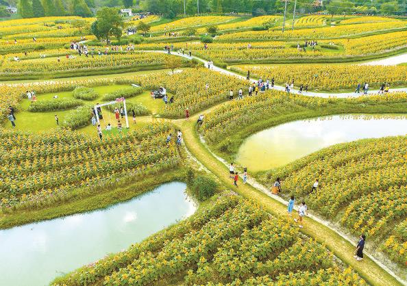 节日期间,金山区花开海上生态园内200亩向日葵竞相盛放,吸引众多市民游客 本报记者 陶磊 摄