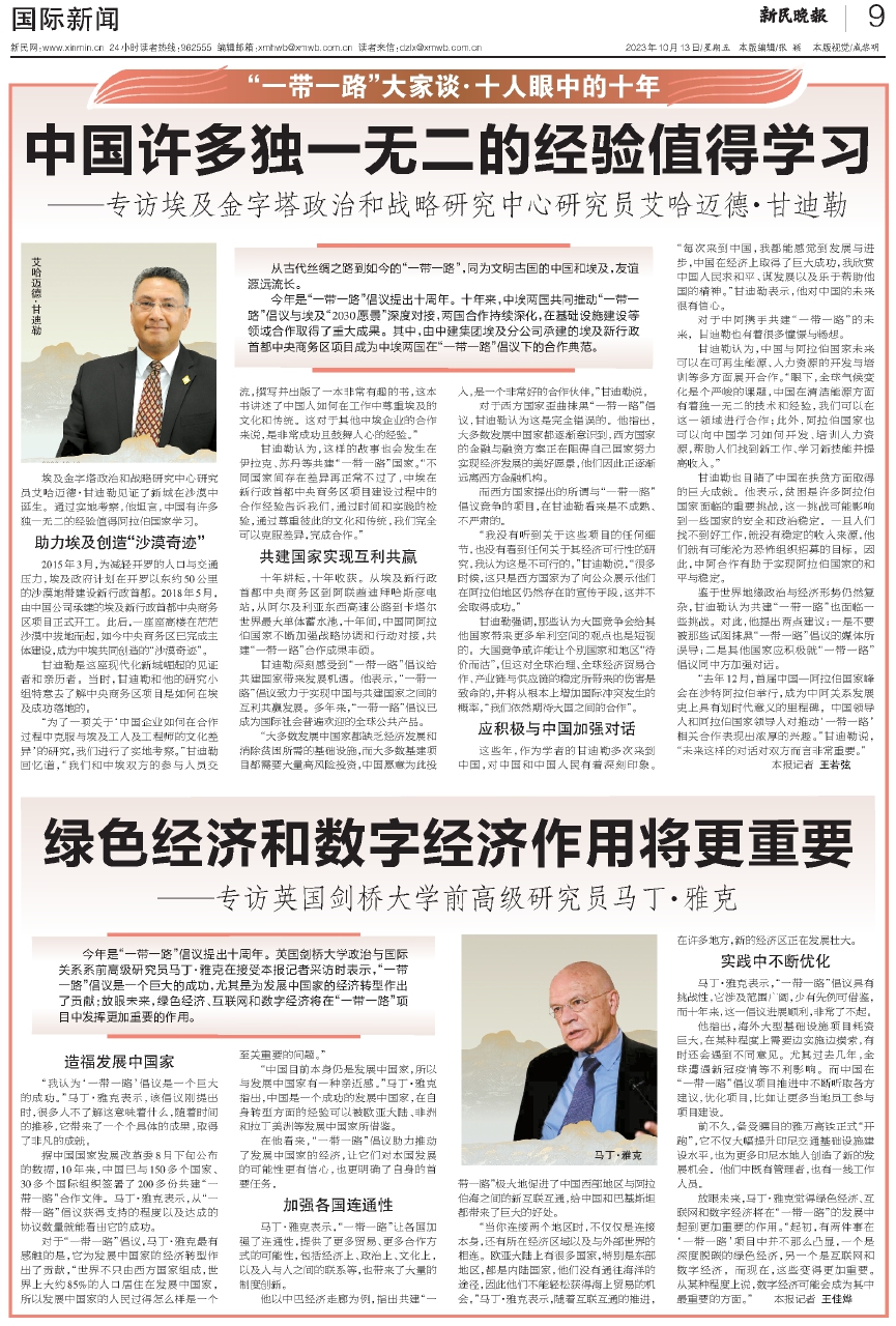 “去年12月,首届中国—阿拉伯国家峰会在沙特阿拉伯举行,成为中阿关系发展史上具有划时代意义的里程碑。中国领导人和阿拉伯国家领导人对推动‘一带一路’相关合作表现出浓厚的兴趣。”甘迪勒说,“未来这样的对话对双方而言非常重要。”