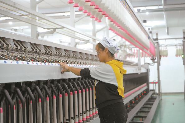 在巴楚县北部,9.7万平方公里的工业园区集聚了130家企业,形成了以纺织服装为主导产业的产业体系。走进园区内的新喜恒纺织厂,一个个纱锭经过整经、浆纱等一系列流程,最终蜕变为一匹匹布料。上海援疆干部、巴楚县发改委副主任曹惟介绍,在超过5亿元援疆资金的持续注入下,园区已初步形成了从棉花选种育种、规模化种植、籽棉加工、纺纱织布、服装加工、交易储运的全产业链,目前投产规模超过150万锭。与此同时,援疆资金在园区内投资厂房后,已有12家企业入驻,解决了8000余人的就业难题。