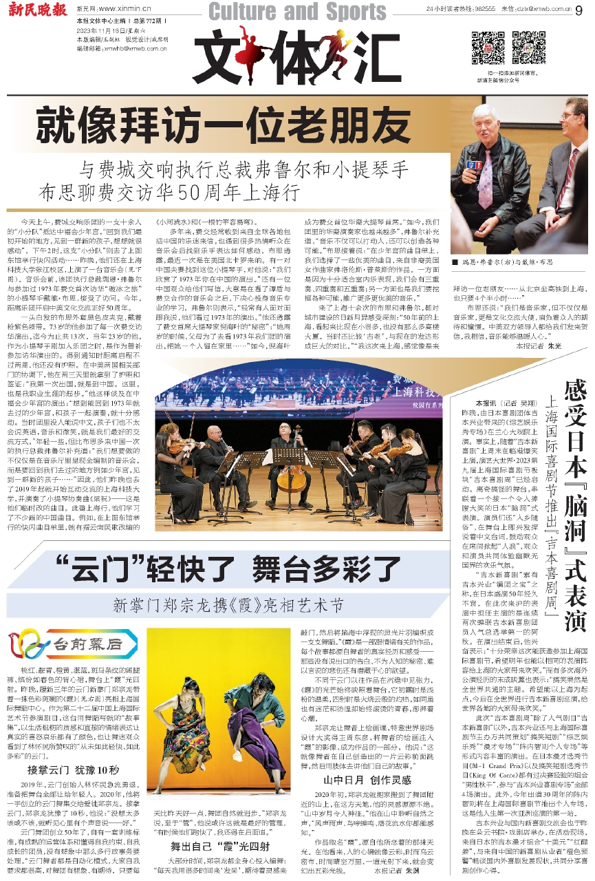 一头白发的布思外套黑色皮夹克,戴着粉紫色领带。73岁的他参加了每一次费交访华演出,迄今为止共13次。当年23岁的他,作为小提琴手刚加入乐团之时,是作为替补参加访华演出的。得到通知时距离启程不过两周,他还没有护照。在中美两国相关部门的协调下,他在两三天里就拿到了护照和签证:“我第一次出国,就是到中国。这里,也是我职业生涯的起步。”他这样谈及在中福会少年宫的演出:“想到能回到1973年就去过的少年宫,和孩子一起演奏,就十分感动。当时团里没人能说中文,孩子们也不太会说英语,音乐和微笑,就是我们最好的交流方式。”年轻一些,但比布思多来中国一次的执行总裁弗鲁尔补充道:“我们想要做的不仅仅是在音乐厅里呈现全编制的音乐会,而是要回到我们去过的地方例如少年宫,见到一群新的孩子……”因此,他们昨晚也去了2019年起就开始互动交流的上海科技大学,并演奏了小提琴协奏曲《梁祝》——这是他们临时改的曲目。此番上海行,他们学习了不少新的中国曲目。例如,在上图东馆举行的快闪曲目单里,就有据云南民歌改编的《小河淌水》和《一根竹竿容易弯》。