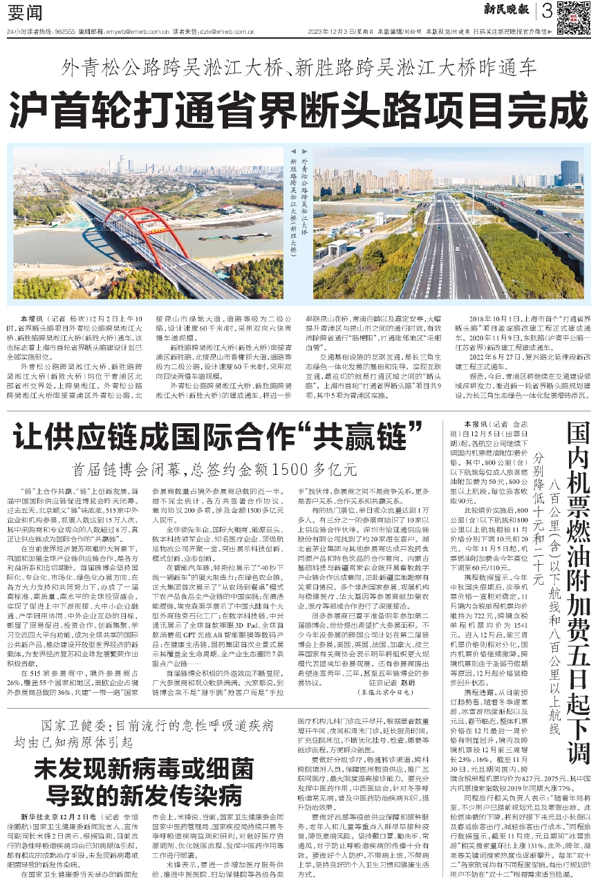 本报讯(记者 杨欢)12月2日上午10时,省界断头路项目外青松公路跨吴淞江大桥、新胜路跨吴淞江大桥(新胜大桥)通车,这也标志着上海市首轮省界断头路建设计划已全部实施到位。