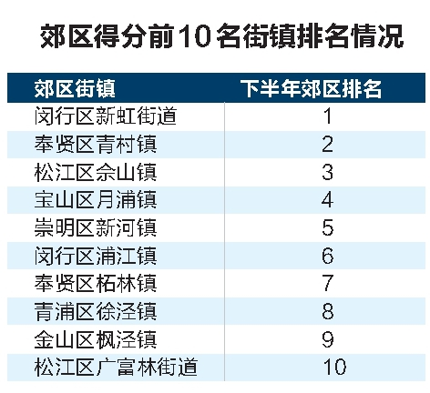郊区街镇中下半年城管执法工作社会满意度评分位列前10名的依次是闵行区新虹街道、奉贤区青村镇、松江区佘山镇、宝山区月浦镇、崇明区新河镇、闵行区浦江镇、奉贤区柘林镇、青浦区徐泾镇、金山区枫泾镇、松江区广富林街道。