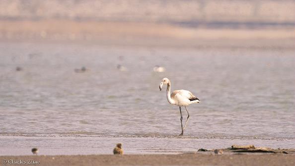 大红鹳 红鹳目红鹳科火烈鸟属,又名大火烈鸟,是一种体大而甚高(130厘米)的偏粉色水鸟。嘴粉红而端黑,嘴形似靴,颈甚长,腿长,红色,两翼偏红。亚成鸟浅褐色,嘴灰色。栖息于人迹罕至的宽阔浅水域。常结成数十至上百只的大群一起生活。近年来在中国新疆、青海、山东、河北、江苏、浙江、陕西等地多次零星出现。 赵津海供图