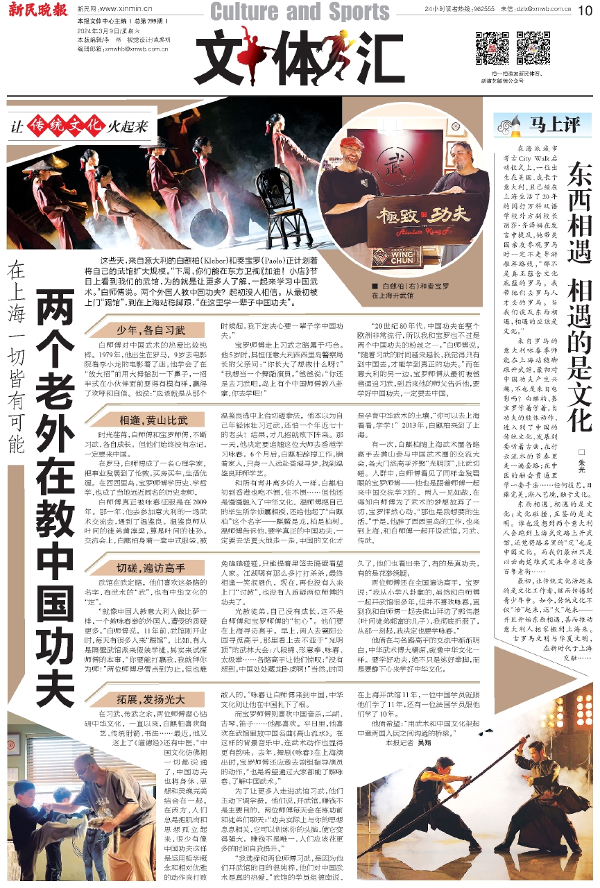 这些天,来自意大利的白麒柏(Kleber)和秦宝罗(Paolo)正计划着将自己的武馆扩大规模。“下周,你们能在东方卫视《加油!小店》节目上看到我们的武馆,为的就是让更多人了解,一起来学习中国武术。”白师傅说。两个外国人教中国功夫?起初没人相信。从最初被上门“踢馆”,到在上海站稳脚跟,“在这里学一辈子中国功夫”。
