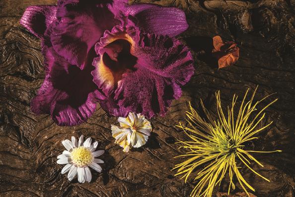 石与花的颜色、质地也要相配,比如绿花配红石就很好。灰色且表面粗糙的英石则是“百搭”,适合与各种颜色和形态的花相配。我也拍了一些花和老木、朽木的组合照,同样也是为了突出两者在质地上的对比。