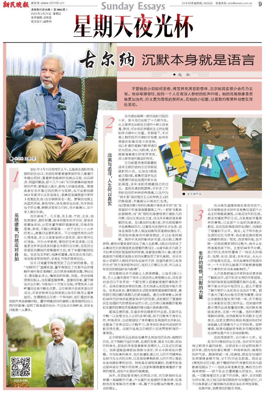 古尔纳出版第一部作品时已经四十岁。至今他已出版了十几部作品。从上海译文出版社引进的十部小说来看,移民、怀乡和反思殖民主义的主题始终占据中心位置。在其笔下,无论是人物的经历还是时空背景,始终在英国和坦桑尼亚之间变换,他以朴素的笔触不断穿透历史与现实、内心与际遇,去打破被有意简化的世界表面,深入探究追问真实的存在。