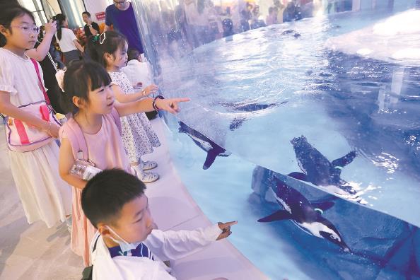 酒店大堂的全景企鹅展池吸引了不少小客人 本报记者 周馨 摄