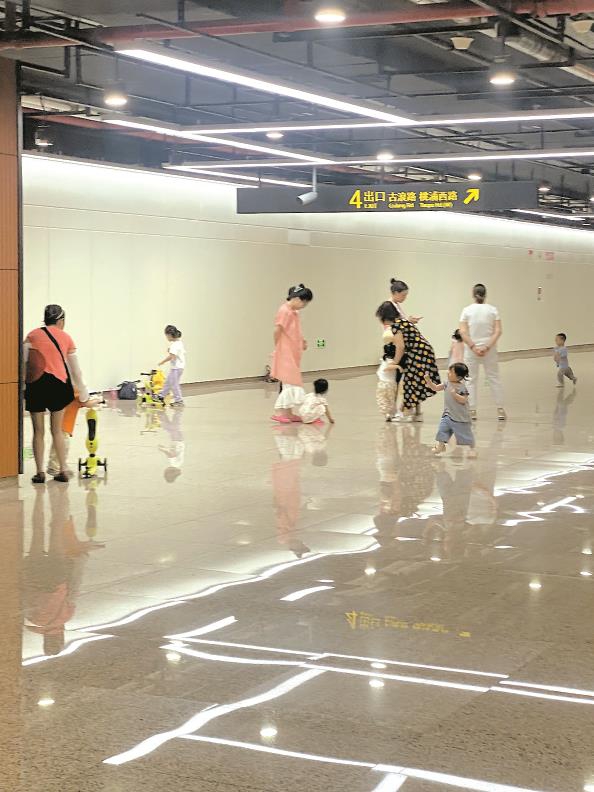 市民金女士也有同样的感受,她家住在地铁15号线古浪路站附近的金光花苑,每次下班回家,都要从古浪路站4号口出站。“一出闸机就能听到小孩的嬉笑声。有时候家长还会全副‘武装’,拿上小板凳、扇子、水杯,还有水果,席地而坐,感觉像在野餐。”金女士说自己也是10岁孩子的家长,非常理解带小朋友的辛苦,也觉得地铁站是个不错的避暑胜地,但前提是,不应该影响正常的通行秩序,“况且小朋友冲来冲去的也很危险,家长不能放任他们在公共场所玩闹”。