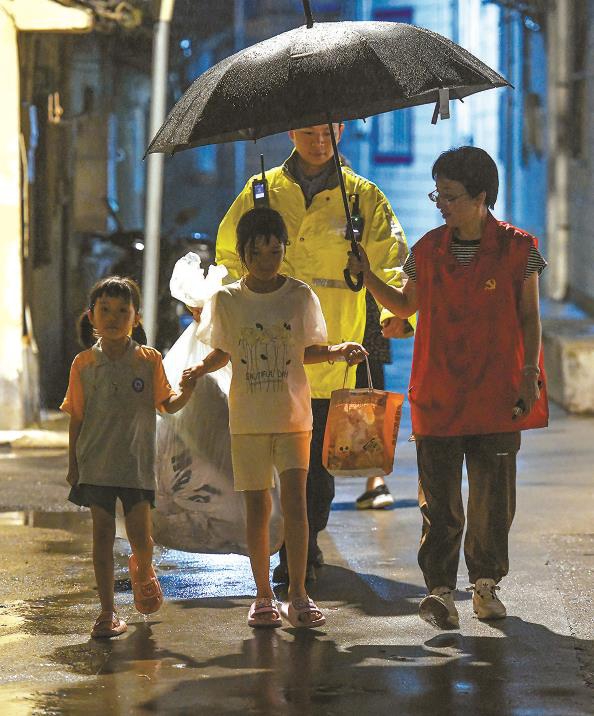 昨晚,金山区山阳镇山新居委会工作人员护送山阳老街上的孩子前往安置点 本报记者 陶磊 摄