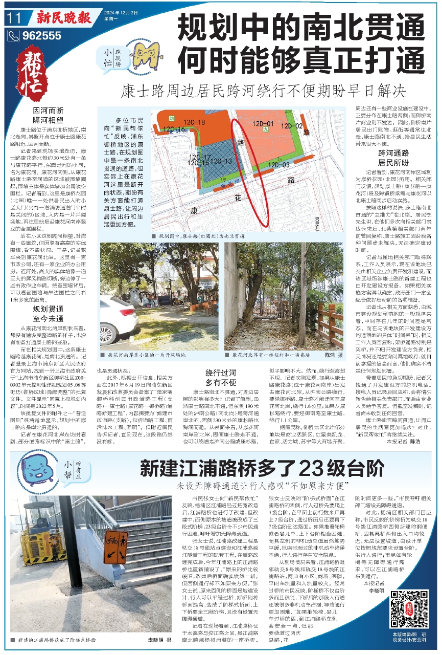 康士路能否跨河贯通,让周边居民的生活圈更加畅达?对此,“新民帮侬忙”将继续关注。