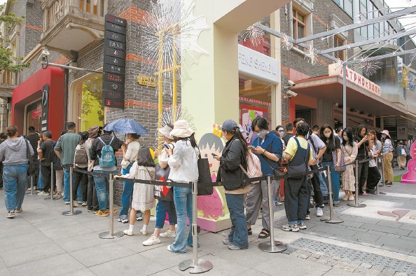 昨天,茂名北路丰盛里的“樱桃小丸子”快闪店外排起了长队,参观者等候入场 本报记者 周馨 摄