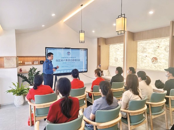 “来,大家跟我念——I can give you cheaper,我可以给你更便宜的价格。”课堂上,毕业于英文专业的吴小龙以寓教于乐的方式将英语教给商户,让他们在轻松愉快的氛围中掌握这些交流技能。在提供英语培训的同时,执法人员还为商铺带来了关于跨门经营、垃圾分类、食品安全等各方面的法律法规宣传,通过生动的案例解析和面对面的咨询服务,让商户们深刻理解合规经营的重要性,并为他们提供精准、专业的指导。