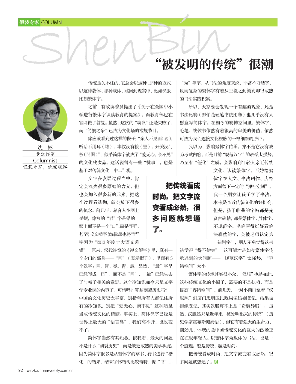 繁体字的传承其实很小众,“汉服”也是如此,这些传统文化的小圈子,需要的不是扶植,而是提高“容错空间”。前几天,一对小两口拿着“汉服照”到厦门思明区民政局做婚姻登记,结果被拒绝登记,其实汉服算不上是“奇装异服”。 虽然,汉服还只是近年来“被发明出来的传统”(历史学家霍布斯鲍姆语),但它有着强大的生命力、潮劲儿,体现的是中国传统文化的巨大的磁场正在征服年轻人。以繁体字为载体的书法,也是一个道理:越是传统,越是时尚。