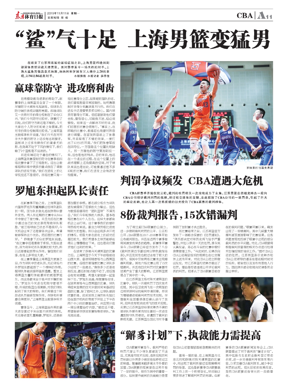 值得一提的是,在上海男篮与北京北控和昨晚对阵天津男篮的比赛中,均出现了裁判员接过话筒解释判罚的场面,这也是新赛季CBA联赛裁判工作上的一个积极变化,尽可能让更多球迷了解裁判判罚的标准。在新赛季的CBA联赛新闻发布会上,CBA联盟提出了对于裁判的“獬豸计划”,其中包括与五名职业裁判签订劳动合同,进一步完善裁判考核体系等内容,力求完善CBA裁判体系,减少争议判罚的出现,但从目前的效果而言,显然CBA联赛还有很长的一段路要走。