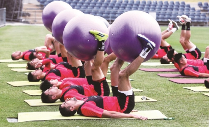 鲜为人知的是,去年6月亚冠客场对阵全北时,球队同样在训练和比赛途中,采用了这一做法。昨天训练正式开始前,大家各自组队进行了抢圈热身,除了孙祥,助理教练奚志康通常也是此时的“主力一员”,和球员们一样,孙祥也换上了训练服,一阵活动之后,他等于也完成了热身:“身材保持得真不错,肚子都没什么。”在一旁的媒体打趣道。当球员们开始有球训练后,“二哥”又跑去一旁的瑜伽垫上做了几组核心力量,“稍微动一动。”他笑着说。