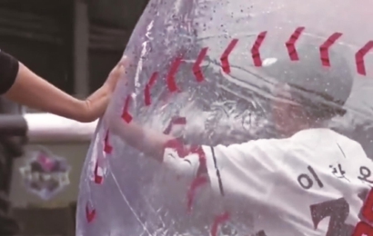 在之前进行的韩国职业棒球联赛的开幕式上,一名小男孩置身塑料球内走向开球点,主办方希望以此提醒人们保持社交距离。棒球联赛将暂时采用空场的方式进行,为了比赛气氛,看台座位上特地贴好了印有观众坐着看比赛的横幅