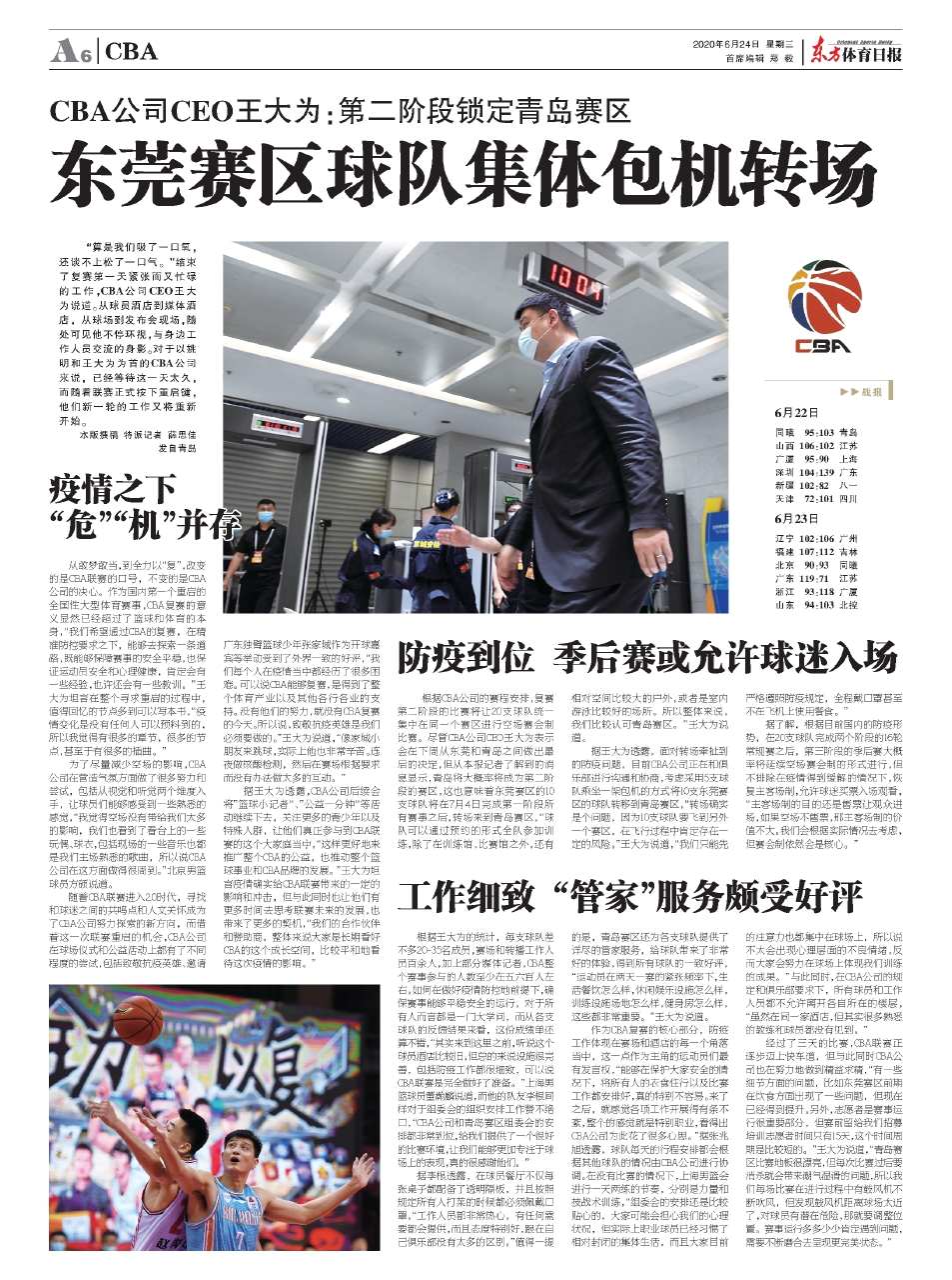 根据CBA公司的赛程安排,复赛第二阶段的比赛将让20支球队统一集中在同一个赛区进行空场赛会制比赛。尽管CBA公司CEO王大为表示会在下周从东莞和青岛之间做出最后的决定,但从本报记者了解到的消息显示,青岛将大概率将成为第二阶段的赛区,这也意味着东莞赛区的10支球队将在7月4日完成第一阶段所有赛事之后,转场来到青岛赛区,“球队可以通过预约的形式全队参加训练,除了在训练馆、比赛馆之外,还有相对空间比较大的户外,或者是室内游泳比较好的场所。所以整体来说,我们比较认可青岛赛区。”王大为说道。