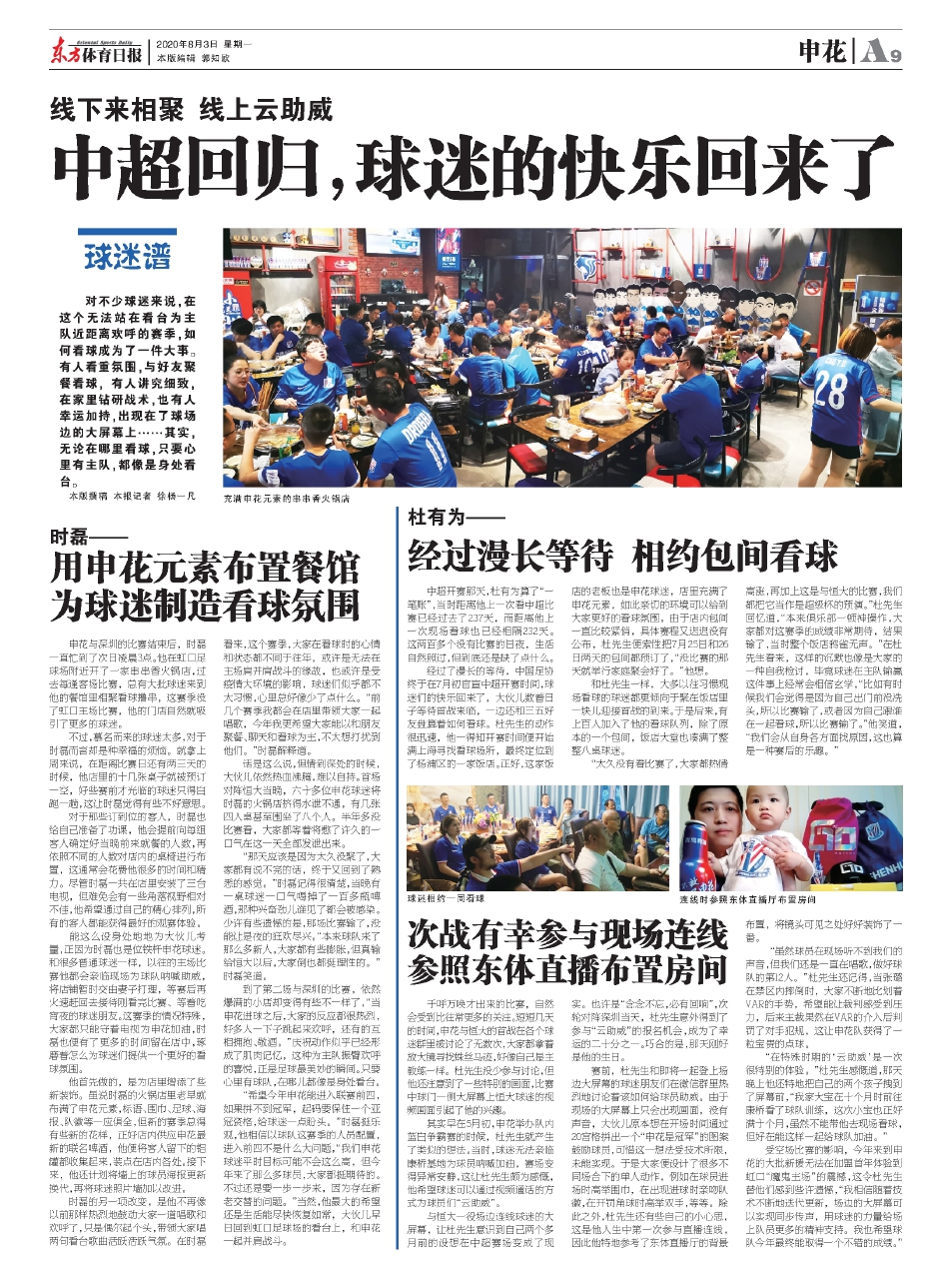 经过了漫长的等待,中国足协终于在7月初官宣中超开赛时间,球迷们的快乐回来了,大伙儿数着日子等待首战来临,一边还和三五好友盘算着如何看球。杜先生的动作很迅速,他一得知开赛时间便开始满上海寻找看球场所,最终定位到了杨浦区的一家饭店。正好,这家饭店的老板也是申花球迷,店里充满了申花元素,如此亲切的环境可以给到大家更好的看球氛围。由于店内包间一直比较紧俏,具体赛程又迟迟没有公布,杜先生便索性把7月25日和26日两天的包间都预订了,“没比赛的那天就举行家庭聚会好了。”他想。