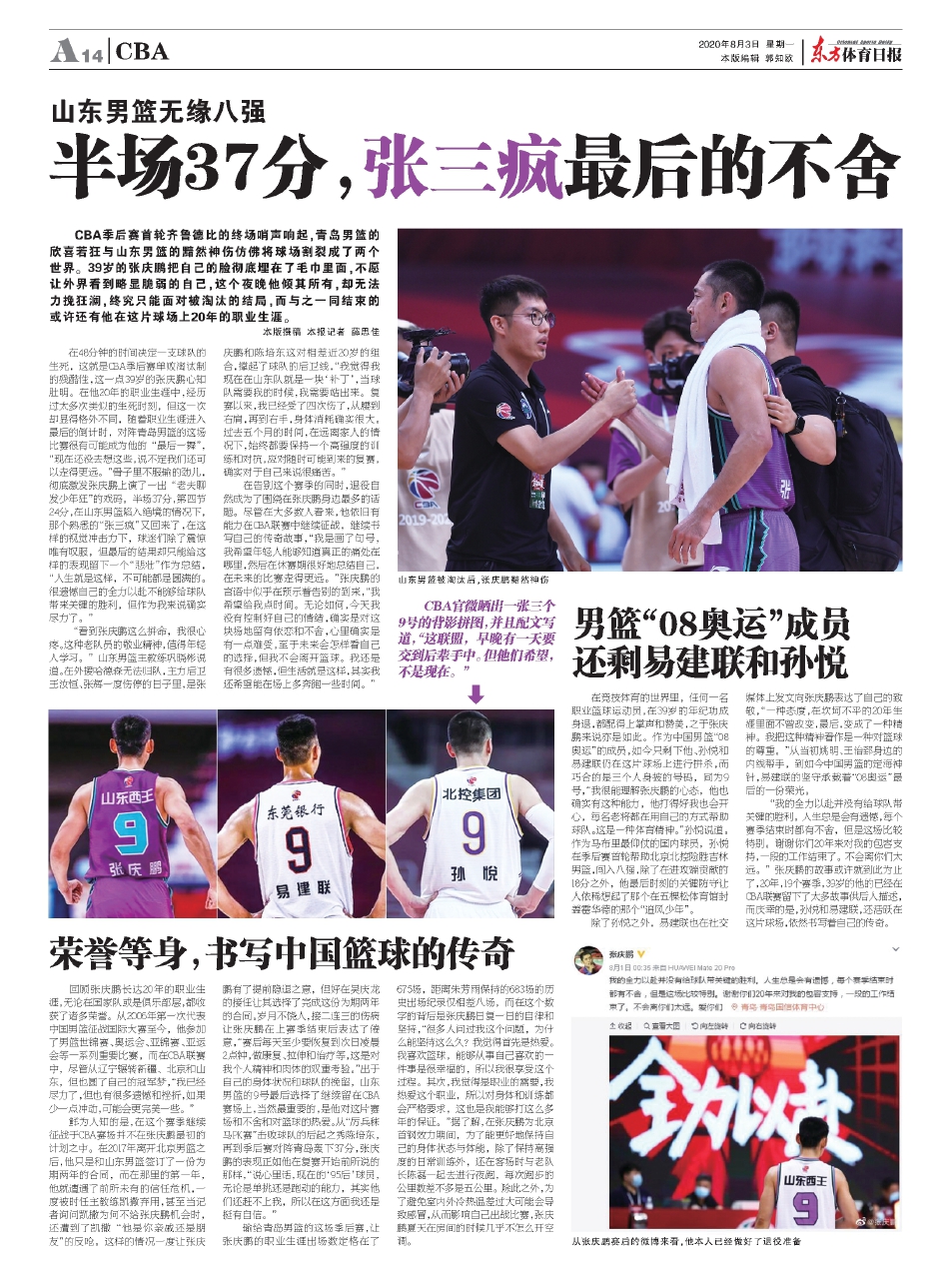 “我的全力以赴并没有给球队带关键的胜利。人生总是会有遗憾,每个赛季结束时都有不舍,但是这场比较特别。谢谢你们20年来对我的包容支持,一段的工作结束了。不会离你们太远。”张庆鹏的故事或许就到此为止了,20年,19个赛季,39岁的他的已经在CBA联赛留下了太多故事供后人描述,而庆幸的是,孙悦和易建联,还活跃在这片球场,依然书写着自己的传奇。