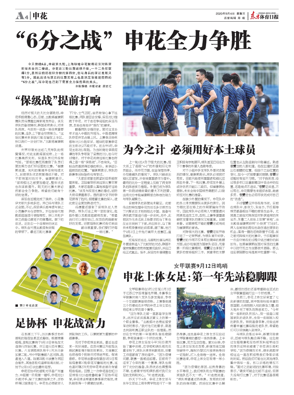 今天傍晚6点,中超第九轮,上海绿地申花就将迎来对阵深圳佳兆业的二番战。申花近三轮比赛战绩不佳,一平二负仅取得1分,虽然目前还在积分榜的第四位,但与身后的深足差距只有1分,因此这场与深足的比赛实际上也是决定谁能进前四的“6分之战”,而申花也已到了需要全力保前四的关头。本版撰稿 本报记者 龚哲汇