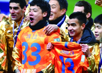 鲁能泰山队守门员王大雷(前左)身着队友金敬道球衣,球员刘彬彬(前右)手持队友张弛球衣在颁奖仪式上。金敬道与张弛因伤未能出席颁奖仪式
