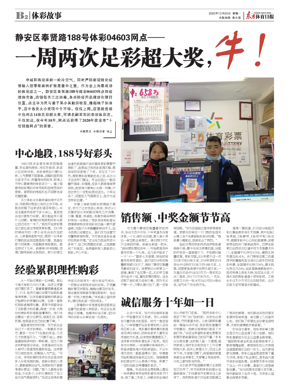 申城即将迎来新一轮冷空气,同时严防新冠肺炎疫情输入型零星案例扩散是重中之重。作为全上海最成功的体彩店之一,静安区奉贤路188号体彩04603网点防疫措施完备,店铺每天三次消毒,各类防疫用品摆放在醒目位置。店主毕为民与妻子吴小英勤劳致富,撸起袖子加油干,店中各类大小奖项中个不停。仅仅上周,店里就连续中出两次14场足彩超大奖,可谓名副其实的幸运体彩店。不仅如此,在今年10月,网点还获得了2020年度全市“十佳销售网点”的荣誉。