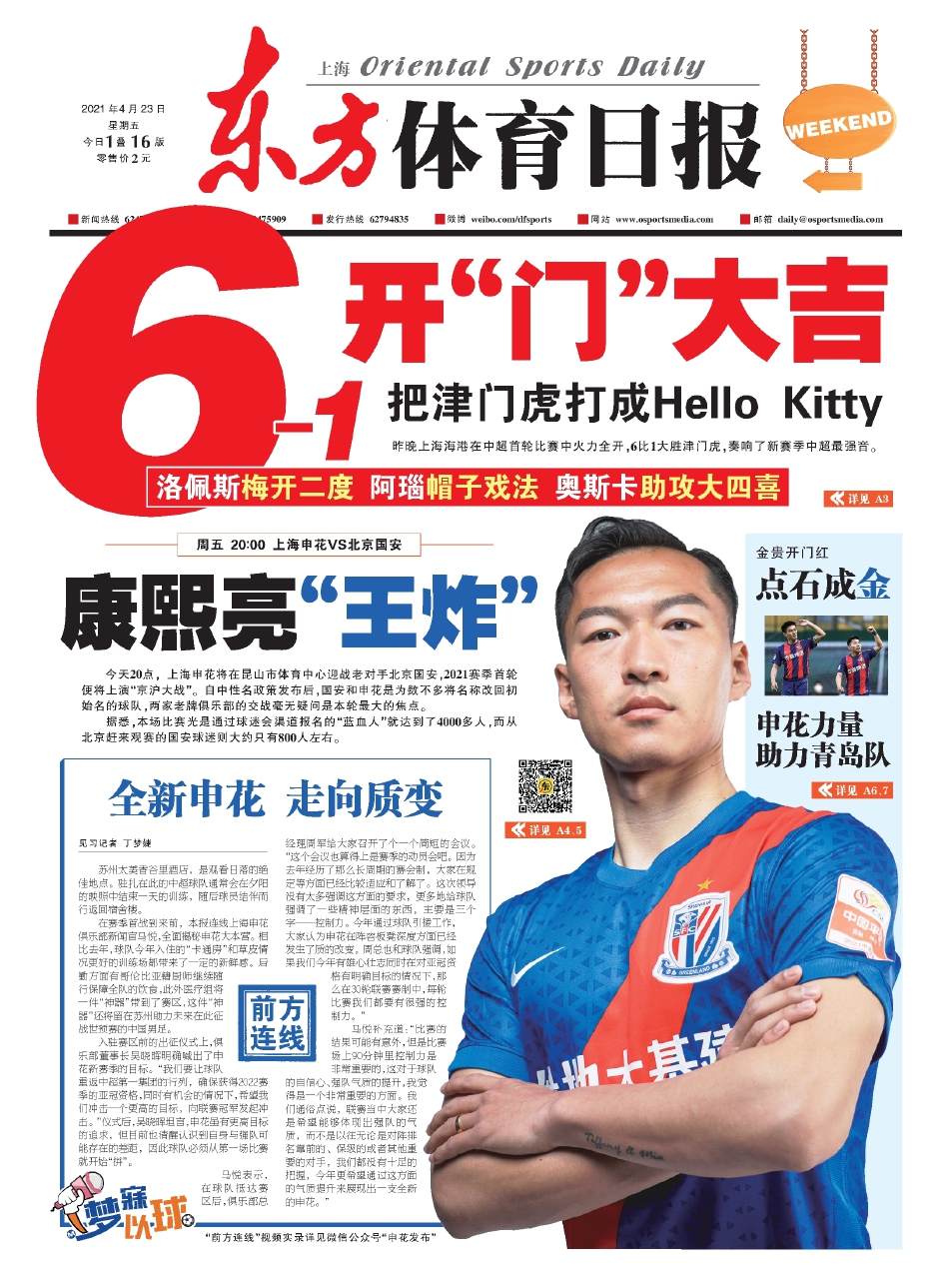 昨晚上海海港在中超首轮比赛中火力全开,6比1大胜津门虎,奏响了新赛季中超最强音。