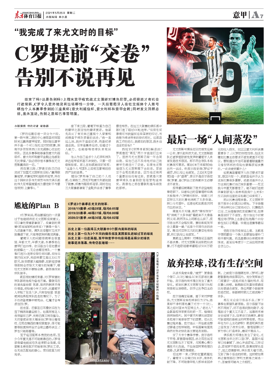 葡萄牙人的问题很简单也很直接,年龄太大,年薪太高,本赛季他在意甲打进29球,依旧是当今足坛最好的前锋之一,无论去哪支球队,一个赛季打进20+进球没有任何问题。但他毕竟已经36岁,税后年薪又高达3000万欧元,除非愿意大幅降薪,在新冠疫情导致转会市场大大缩水的背景下,哪怕尤文图斯不要转会费,都很难找到球队接手。