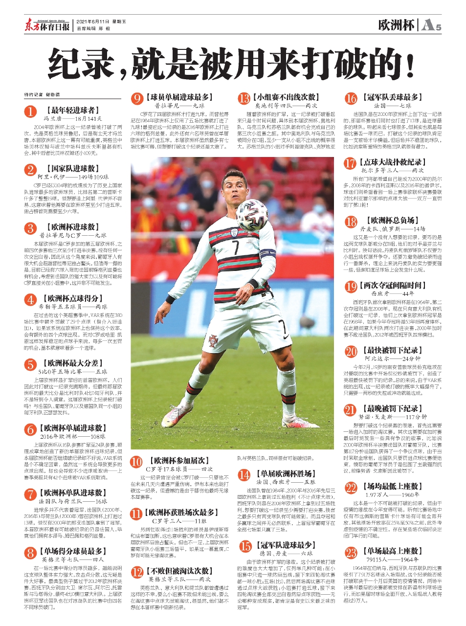 C罗花了四届欧洲杯才打进九球,而普拉蒂尼在1984年欧洲杯上仅用了五场比赛就打进了九球!最接近这一纪录的是2016年欧洲杯上打进六球的格列兹曼,此外还有六名球员曾在单届欧洲杯上打进五球。本届欧洲杯虽然最多有七场比赛可踢,但想要打破这个纪录还是太难了。