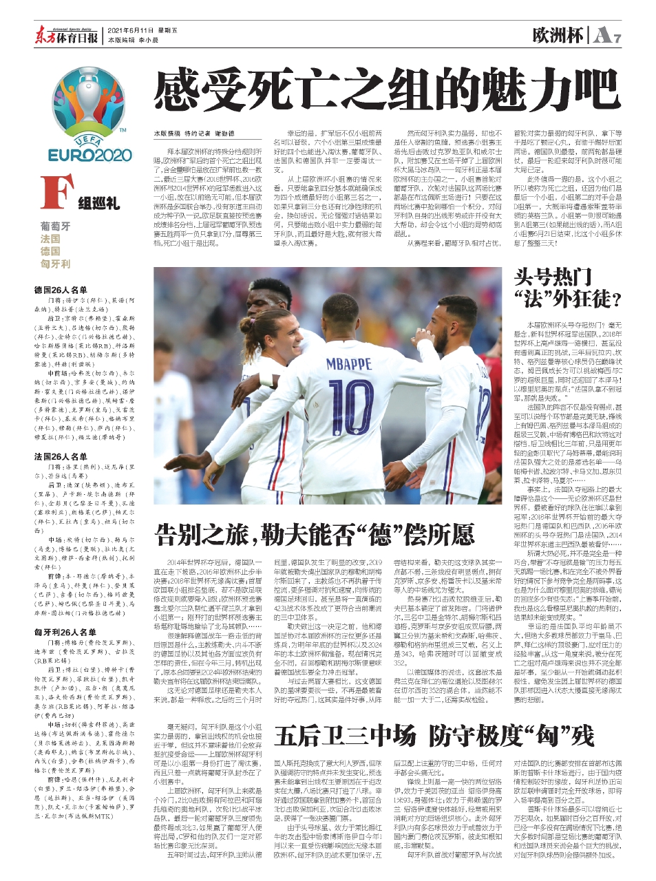 拜本届欧洲杯的特殊分档规则所赐,欧洲杯扩军后的首个死亡之组出现了,含金量哪怕是放在扩军前也数一数二,最近三届大赛(2018世界杯、2016欧洲杯与2014世界杯)的冠军悉数进入这一小组,放在以前绝无可能,但本届欧洲杯是多国联合举办,没有东道主自动成为种子队一说,欧足联直接按预选赛成绩排名分档,上届冠军葡萄牙队预选赛五胜两平一负只拿到17分,屈尊第三档,死亡小组于是出现。