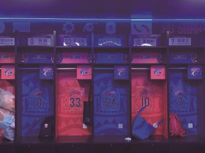 虽然是名义上的过渡主场,但作为2019年篮球世界杯的办赛场馆,东方体育中心的软硬件设施以及整体视觉体系的架构丝毫不含糊。在位于B2层的主队更衣室里,配备了储物柜、淋浴房、按摩床、教练使用的战术室,可谓一应俱全。整个色调以蓝色和橙色为主,随着CBA公司对于各支球队的视觉体系进行更新和升级,上海男篮将这一点发挥得淋漓尽致。值得一提的是,新晋加盟球队的王哲林、任骏威和袁堂文的铭牌赫然在列,王哲林的身边分别是他在国青和国家队时期的两位原队友罗汉琛和董瀚麟。