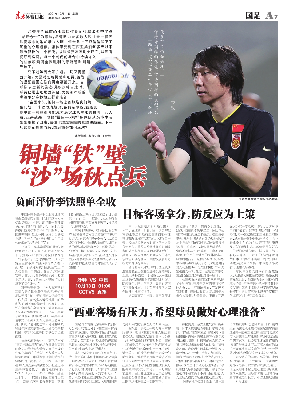 在接受真正意义上的“客场”挑战前,日本队的遭遇为中国队敲响了警钟。本轮沙特对阵国足,吉达·阿卜杜拉国王体育城体育场上座率有望创疫情以来的新高,这很可能成为国足本届世预赛以来难度最大的比赛。“12强赛之前,谁能想到日本队三场比赛只赢一场、只进一球。当然,其他球队目前的战绩都很接近。打沙特队,我们先要做好自身的准备工作。客场肯定不容易,我希望球员做好心理准备。”李铁和他的球队需要面对的,除了难以逾越的小组领头羊本身,还有超过5万人上座人数的球场带来的心理压力。