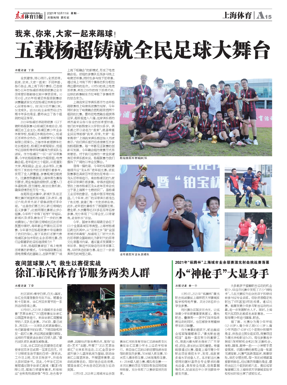 全民健身,同心同行;全民足球,我来、你来,大家一起来!不同年龄、各行各业、线上线下两个赛场,已连续举办五年的杨浦足球超级联赛让全市足球爱好都能够在其中享受足球。10月10日,2021年杨浦足球超级联赛总决赛暨颁奖仪式在杨浦区体育活动中心足球场举行。自5月30日开赛以来,50支球队,近1500名业余球员经过为期半年多的角逐,最终决出了各个组别的冠亚季军。