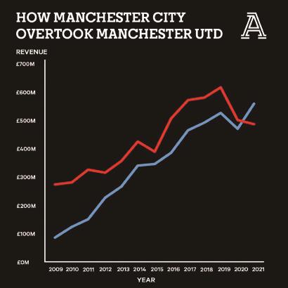 首先说明,2020-2021赛季有一定的特殊性,由于疫情缘故,2019-2020赛季欧冠淘汰赛被放在了8月进行,相关收入被计入了2020-2021赛季,那个赛季曼城打进了欧冠八强,曼联则在踢欧联杯。此外2020-2021赛季有许多比赛是空场进行,这对曼联的影响也要远远大于曼城(老特拉福德比伊蒂哈德球场多了近两万个座位)。