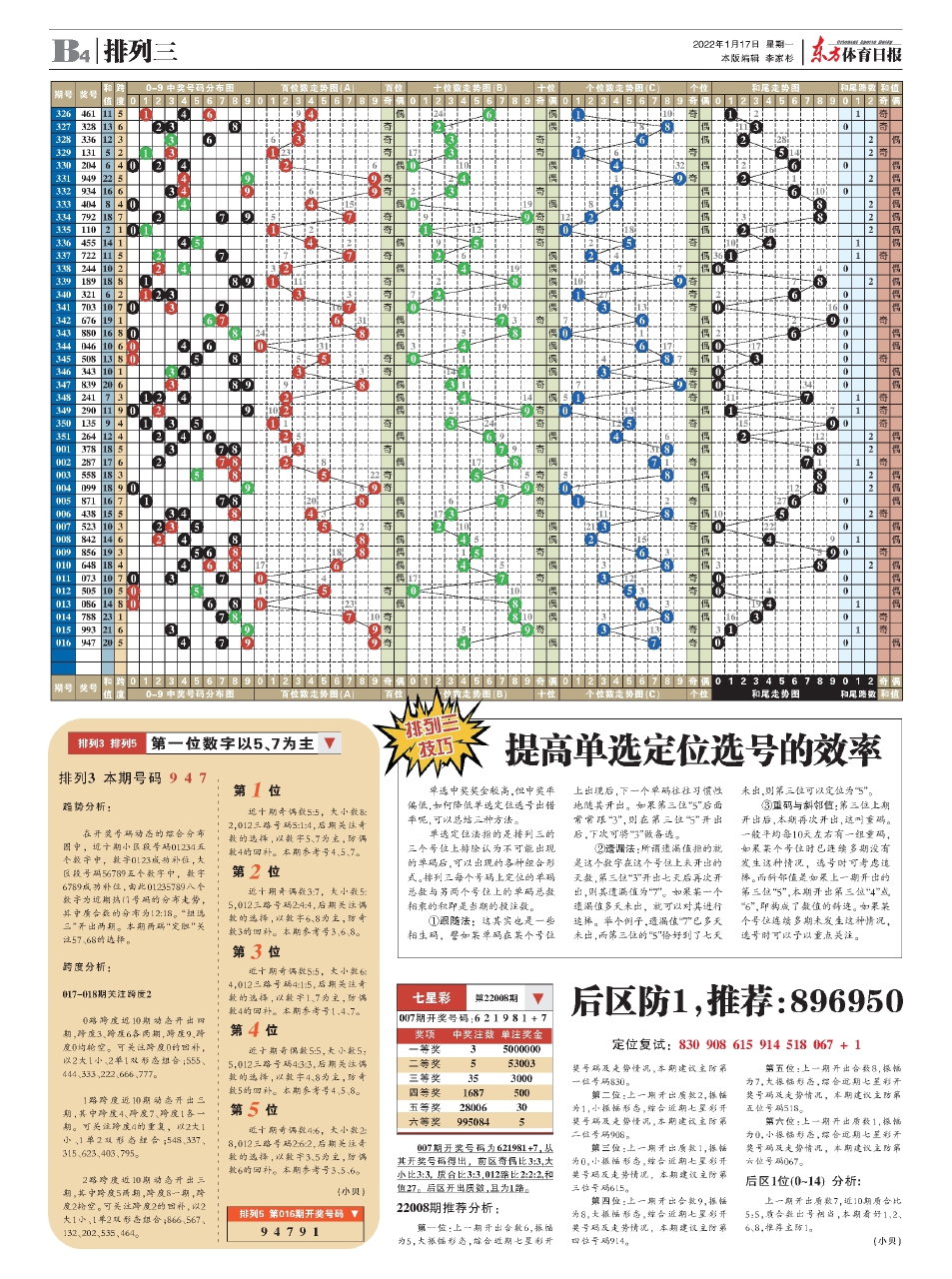 第一位:上一期开出合数6,振幅为5,大振幅形态,综合近期七星彩开奖号码及走势情况,本期建议主防第一位号码830。