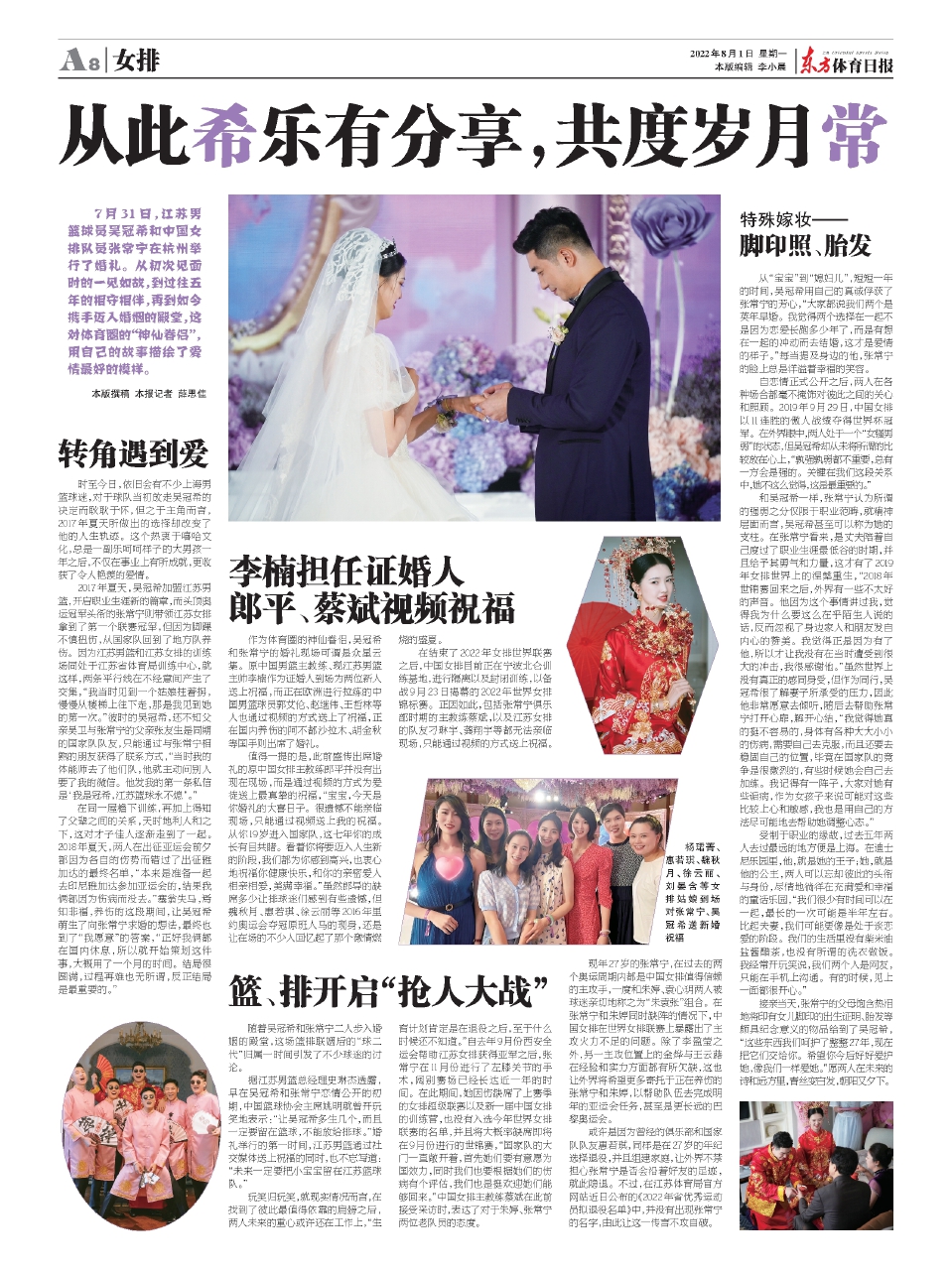 7月31日,江苏男篮球员吴冠希和中国女排队员张常宁在杭州举行了婚礼。从初次见面时的一见如故,到过往五年的相守相伴,再到如今携手迈入婚姻的殿堂,这对体育圈的“神仙眷侣”,用自己的故事描绘了爱情最好的模样。