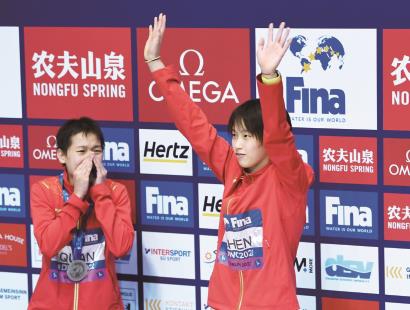 在世界杯开赛首日的女子双人10米台决赛中,17岁的陈芋汐和15岁的全红婵以超出亚军近90分的成绩携手夺得冠军,实现了奥运会、世锦赛和世界杯的金牌“大满贯”。“和今年世锦赛相比,我们可能有一些进步。我们需要系统训练维系彼此之间的默契感。”陈芋汐说,“金牌‘大满贯’对于运动员来说非常不容易,但我们的追求不限于此,还有更高目标等着我们去实现。”