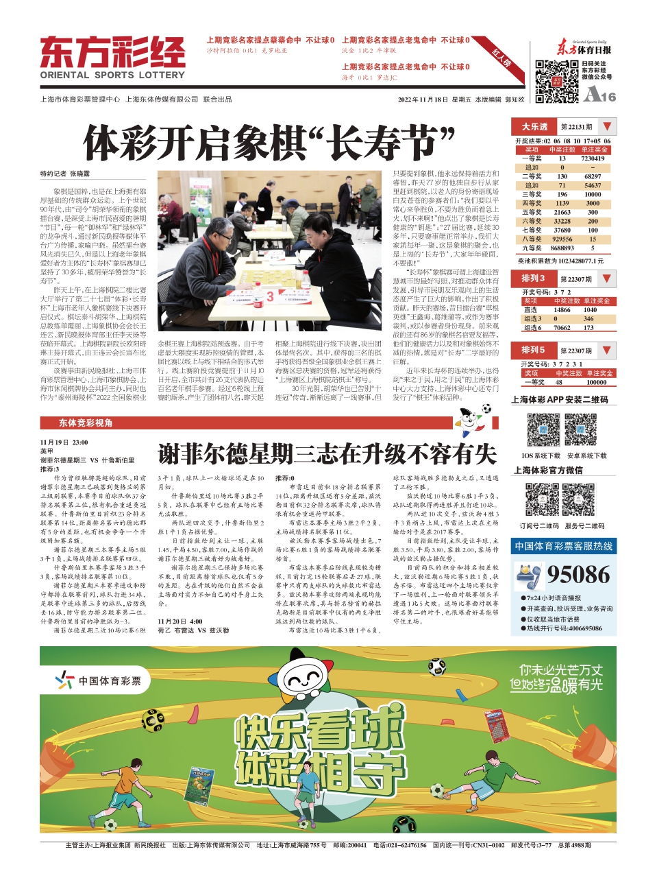 近年来长寿杯的连续举办,也得到“来之于民,用之于民”的上海体彩中心大力支持,上海体彩中心还专门发行了“棋王”体彩品种。