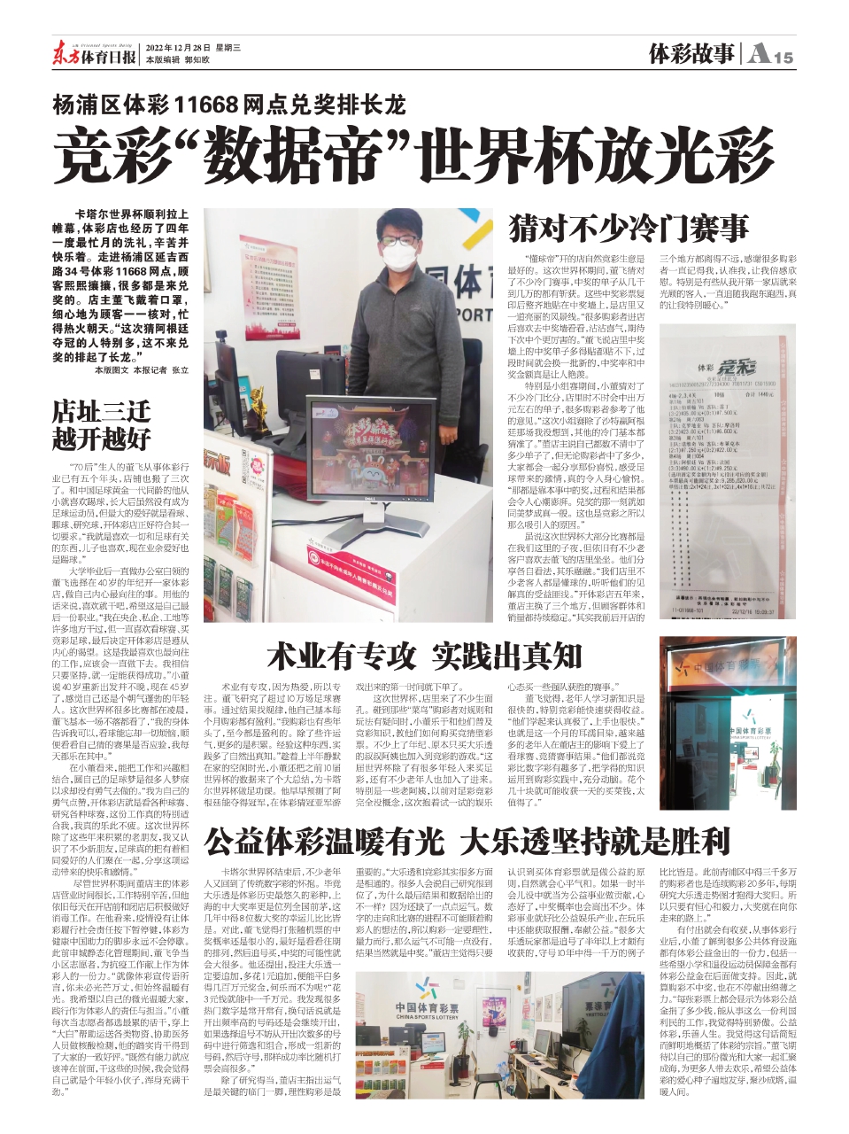 特别是小组赛期间,小董猜对了不少冷门比分,店里时不时会中出万元左右的单子,很多购彩者参考了他的意见。“这次小组赛除了沙特赢阿根廷那场我没想到,其他的冷门基本都猜准了。”董店主说自己都数不清中了多少单子了,但无论购彩者中了多少,大家都会一起分享那份喜悦,感受足球带来的激情,真的令人身心愉悦。“那都是靠本事中的奖,过程和结果都会令人心潮澎湃。兑奖的那一刻就如同美梦成真一般。这也是竞彩之所以那么吸引人的原因。”