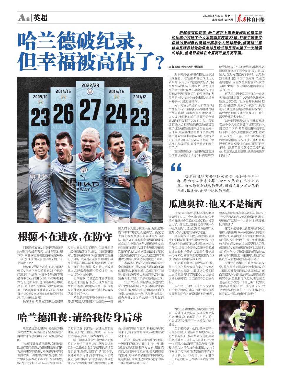 听起来有些荒谬,哈兰德在上周末曼城对伯恩茅斯的比赛中打进了个人本赛季英超第27球,打破了阿奎罗保持的曼城队内英超单赛季个人进球纪录,但英格兰媒体与足球界讨论的焦点却是哈兰德是否加盟了一支错误的球队,他是否应该在今夏离开蓝月亮军团。